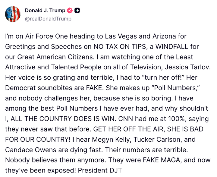 The president, traveling aboard Air Force One for his “No Tax On Tips” event, wrote on his Truth Social platform that “The Five” star had a “terrible and grating” voice.